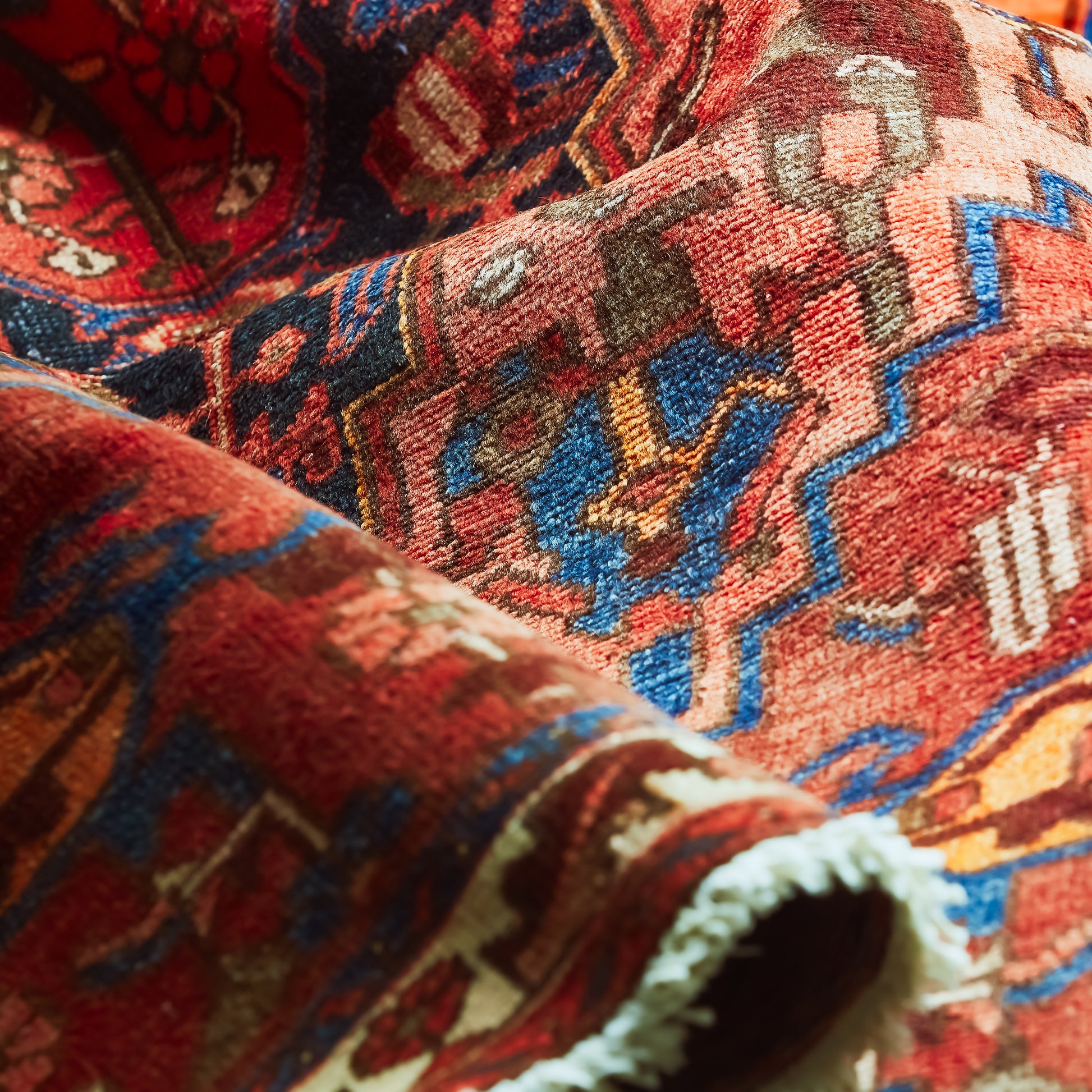 The color scheme of this Malayer rug is both vibrant and harmonious. The deep reds and indigo blues form a rich, luxurious backdrop, while earthy tones like terracotta and brown add warmth and grounding. Light ivory and beige accents create striking highlights, enhancing the visibility of each motif and adding a touch of brightness to the overall design. This color palette not only enhances the visual appeal but also reflects the traditional dyeing techniques of Malayer artisans, with colors derived from natural sources that have aged beautifully over time.